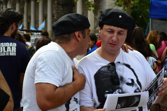 Um 15 Uhr haben sich auf dem Platz Demonstranten aller politischen Couleur versammelt, um gegen Beschlüsse der Regierung zu protestieren. Als die Madres in ihren weißen Kopftüchern den Platz betreten, bricht heftiger Jubel aus. Während der ersten Demonstrationen vor über 35 Jahren trugen die Mütter Babywindeln als Kopftücher, auf denen der Name des von der Militärjunta verschleppten Kindes stand. Heute steht Madres de Plaza de Mayo auf den Tüchern.
