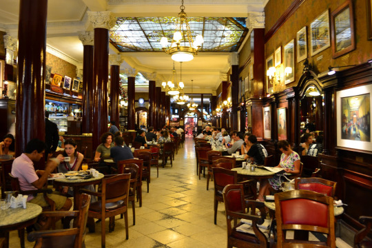 Das eigentliche Wohnzimmer der Hauptstädter ist das Café. Hier wird diskutiert, gestritten, über Politik, Wirtschaft und die Verwandtschaft gemeckert, hier werden Pläne geschmiedet und Verträge unterschrieben. Rund 8000 Cafés soll es in Buenos Aires geben – viele erinnern an die alten Kaffeehäuser in Wien und Prag. Wie das Tortoni, das 1858 eröffnet wurde und seine Innenausstattung seit dem frühen 20. Jahrhundert nicht verändert hat.