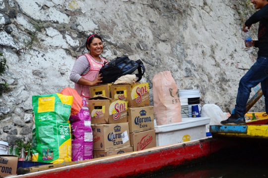 Rudernde Händler bieten ihre Waren feil: frisch gebackene Tortillas, Tacos, Luftballons, bunte Puppen, Souvenirs, frisch gepflückte Blumen, Gemüse, Obst, Käse und Getränke. Manche Boote sind schwimmende Tante-Emma-Läden.