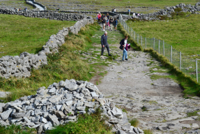 An Steinwällen vorbei geht es steil hinauf zur Festung, die nach Aonghus MacNatfráich, König von Cashel im 5. Jahrhundert n. Chr. benannt wurde. So die Legende. Der irische Name des Forts ist Dún Aonghasa. Ausgrabungen haben ergeben, dass in der Festung Menschen über einen Zeitraum von 2500 Jahren gelebt haben, von 1500 v. Chr. bis 1000 n. Chr. Dún Aonghasa gehört seit Ende des 19. Jahrhunderts zu den Nationalmonumenten Irlands. Vor uns wandert eine Gruppe Amerikanerinnen in Flip-Flops den steinigen Weg hinauf und flucht über das falsch gewählte Schuhwerk. Eine von ihnen gibt auf und setzt sich auf eine Bank am Wegrand. Ein Stein hat sich durch einen ihrer Flip-Flops gebohrt. Keinen Schritt weiter wird sie gehen, ruft sie ihren Freundinnen zu.