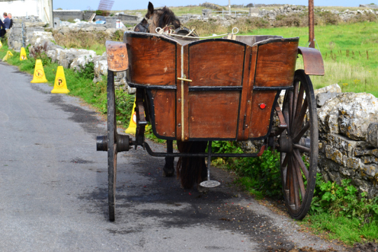 Mühsam trottet Cappuccino den Hang hinauf. „Gasta, gasta!“ ruft Kevin, der Kutscher dem kaffeebraunen Pferd zu, als die Strecke wieder gerade wird. Gasta ist irisch und bedeutet „schnell“. Es ruckelt ganz schön in dem alten Pferdewagen, der mich mit seiner runden Form an eine mittelalterliche Badewanne erinnert. „Er stammt aus dem Jahr 1915. Ich habe ihn vor über 20 Jahren auf einer Auktion in Lisdoonvarna gekauft“, antwortet Kevin, als wir ihn nach dem Alter des Wagens fragen. Wir sind auf dem Weg zu Dún Aengus, einem bronzezeitlichen Fort, das auf dem Rand einer Klippe thront. Am Fuß des Forts lässt Kevin uns aussteigen und gesellt sich auf ein Guinness zu den anderen Kutschern, die hier auf Fuhrgäste warten.
