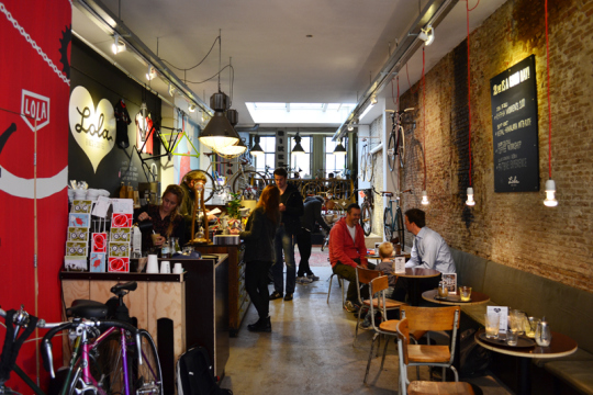 Ich bin unterwegs zu „Lola Bikes & Coffee“. Das Café, das als beste Kaffeebar der Niederlande ausgezeichnet wurde, ist Fahrradshop mit Reparaturwerkstatt und Café zugleich. Der Besitzer liebt Fahrräder und Kaffee und kam so auf die Idee mit dem Laden. Die Atmosphäre ist trotz der mit Fahrrädern dekorierten Wände gemütlich. Es duftet nach Espresso und frisch gebackenem Kuchen. An den Tischen sitzen Studenten und diskutieren. Ein älterer Mann, der wie ein Bohemien aus vergangenen Tagen aussieht, sitzt in einem bequemen Sessel am Fenster und ist in seine Zeitung vertieft.