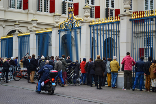 Eine aufgeregte Menschenmenge presst sich gegen das hellblaue Gitter vor dem Noordeinde-Palast, dem Amtssitz des Königs. „What’s going on?“ fragt ein amerikanisches Touristenpaar und gesellt sich zu den Wartenden. Falls gleich etwas passiert, möchten sie das keinesfalls versäumen und bringen auf alle Fälle schon mal ihre Kamera in Stellung. Und passieren wird garantiert etwas. Warum sonst stehen auf dem gegenüberliegenden Platz Pressefotografen und Kameraleute vom Fernsehen? Ob sich Willem-Alexander und Maxima wohl gleich zeigen? Ich gehe auf einen der Fotografen zu und frage, was es mit der Menschenmenge auf sich hat. „Das belgische Königspaar ist zu Besuch und wird in etwa eineinhalb Stunden den Palast verlassen“, antwortet er. Die Amerikaner wussten nicht, dass Belgien einen König samt Königin hat und wollen diese natürlich sehen. „That’s so exciting!“ rufen sie. Ich finde das belgische Königspaar nun nicht so „exciting“ und gehe weiter.