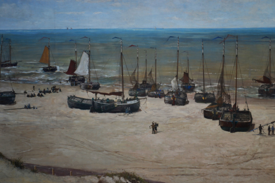Krönender Abschluss des Spaziergangs ist das Panorama Mesdag, wo auf einem überdimensionalen Rundbild der Fischerort Scheveningen gezeigt wird, bevor er zum mondänen Badeort avancierte. Hendrik Willem Mesdag malte das 120 Meter breite und 14 Meter hohe Bild zusammen mit seiner Frau Sientje und drei anderen Malern der Haager Schule im Jahre 1881 in nur vier Monaten. Wir betreten den zylinderförmigen Panorama-Saal über eine Treppe von der Mitte her.