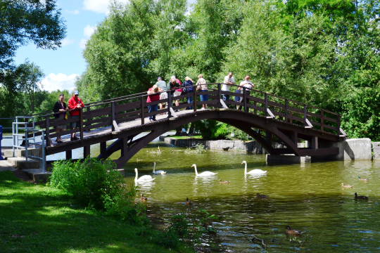 Alles wirkt sehr britisch in Stratford. Die viktorianischen Häuser, die Parks, die Geschäfte mit Waren aus Schottland, die Pubs und Restaurants. Auf dem Avon schwimmen Schwäne und Ruderboote gleiten langsam unter hölzernen Bogenbrücken hindurch. Auf der Wiese am Ufer spielen Musiker, College-Studenten sitzen auf Decken im Gras und diskutieren, Familien und Touristen picknicken im Schatten großer Bäume.