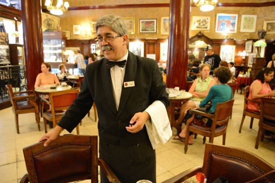 „Ich arbeite hier schon seit 37 Jahren als Kellner“, erzählt uns Angel. „Ich habe Borges und Ernesto Sabato Tee serviert“, erzählt er stolz und fügt hinzu „auch Hillary Clinton habe ich bedient, als sie im Oktober 1997 hier war. Sie hat eine Tasse heiße Schokolade getrunken“. Wie es sich für ein Grand Café gehört, tragen die Kellner im Tortoni einen klassischen schwarzen Anzug, ein weißes Hemd, eine schwarze Fliege und das obligatorische weiße Tuch über dem linken Arm.