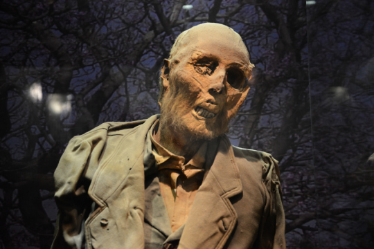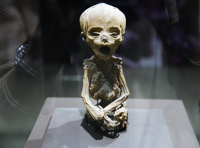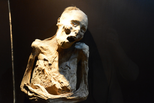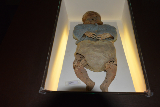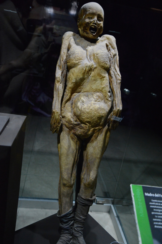 Auch ein mumifizierter Fötus ist dabei – er ist die kleinste Mumie der Welt. Er war im Bauch einer Schwangeren, die an Cholera verstarb. Seine Mutter steht neben ihm.