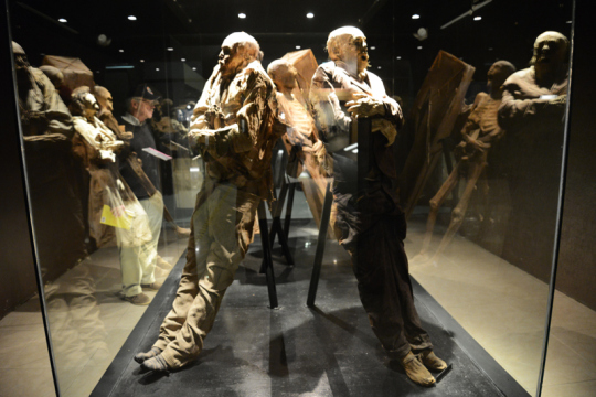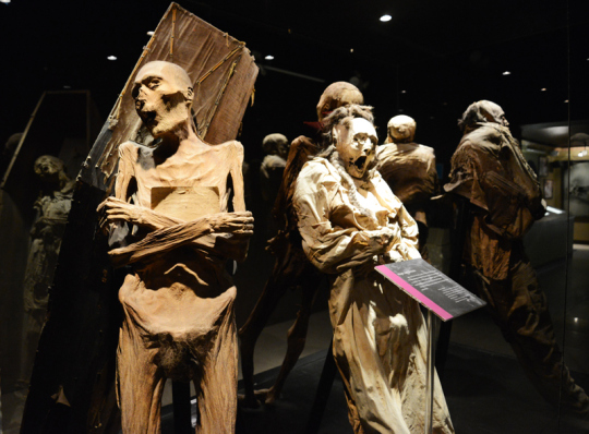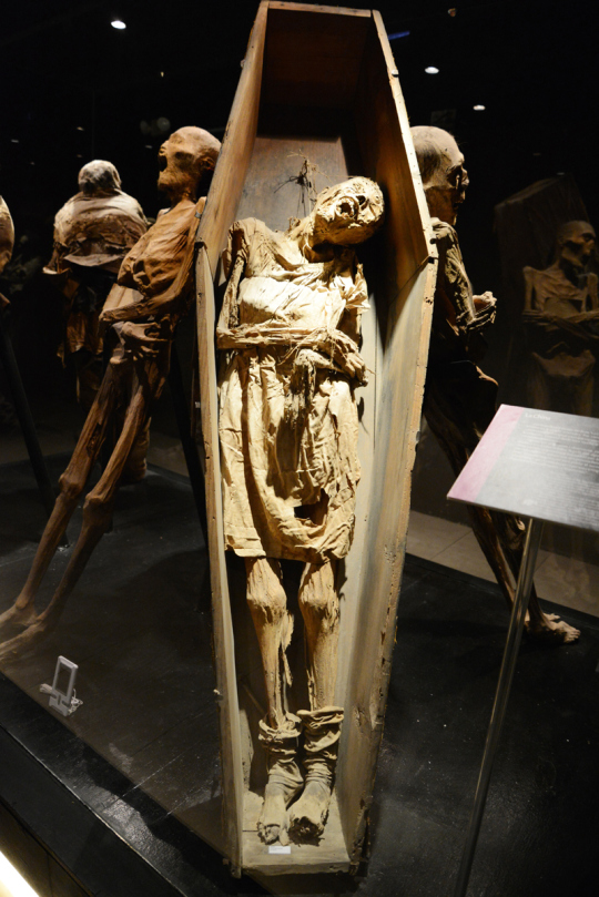 Die Mumien tragen Anzüge, Stiefel, Röcke, Kopfbedeckungen, manche sind nackt oder nur mit Schuhen bekleidet. Sie stehen in verschiedensten Posen in Glasvitrinen an die Wand gelehnt und sitzen oder liegen in einem Sarg. Babys liegen in Windeln und Spitzenkleidchen in Vitrinen.