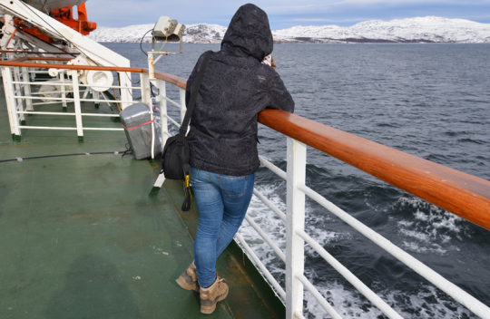 10. April. Eiskalter Wind treibt mich die steile Gangway hinauf. In Kirkenes, im Osten der Finnmark, herrscht noch tiefster Winter. „Wir haben heute -4°, für uns sind das frühlingshafte Temperaturen“, hat mir am Morgen ein Einheimischer erklärt“. Vier Arten von Winter soll es in der Finnmark geben. Der Sommer schaut nur kurz vorbei. Die MS Lofoten, das älteste Schiff der Hurtigruten, wird uns die nächsten paar Tage beherbergen. Seit sie am 5. März 1964 erstmals in Bergen ablegte, hat sie fast drei Millionen Seemeilen zurückgelegt und 1,25 Millionen Gäste befördert. Das mit 87 Metern Länge und 13 Metern Breite kleinste Schiff der Hurtigruten steht seit 2011 unter Denkmalschutz.