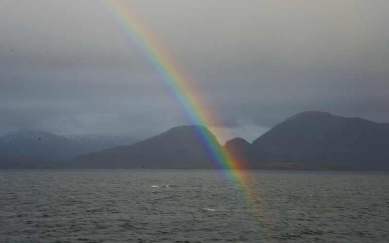 Wenige Minuten später erscheint ein Regenbogen über der benachbarten Felsengruppe. Die Auslöser der Kameras klicken nonstop. Trotz Regen und Kälte möchte jeder das Schauspiel festhalten.