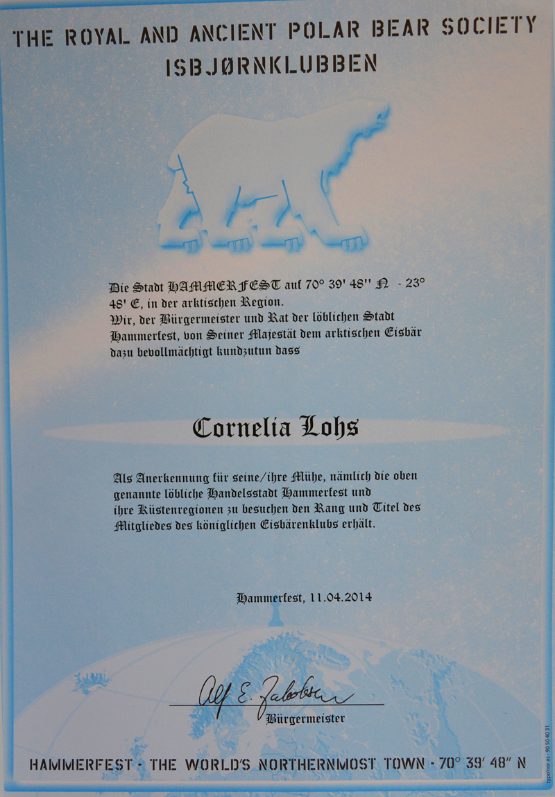 Am Ende unserer Rundfahrt kommen wir am Eisbärenclub vorbei, den wir aus Zeitgründen leider nicht besuchen können. Trotzdem erhalten wir von Katja ein Zertifikat und ein Eisbärenabzeichen und zählen damit zu den über 230.000 weltweiten Mitgliedern des Clubs.