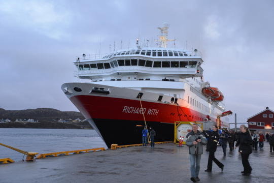 Gegen 20.30 Uhr legen wir in Rørvik neben der MS Richard With an. Gegen das nach dem Hurtigruten-Gründer benannte Schiff wirkt unser kleines Postschiff wie eine Nussschale. Wir gehen zur Besichtigung an Bord des benachbarten Schiffes.