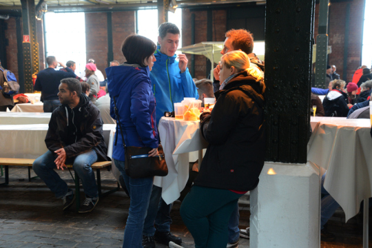 Viele zieht es nach einer langen St.-Pauli-Nacht in die historische Fischauktionshalle. Dort ist es so voll, dass ich mir nur mühsam einen Weg durch die Menge bahnen kann. Dicht gedrängt sitzen Nachtschwärmer und Frühaufsteher an langen Tischen bei Kaffee und Fischbrötchen. Viele sind schon seit fünf Uhr hier. Wer keinen Platz ergattern konnte, steht mit Kaffeebecher oder Bierflasche in der Hand in den Gängen.