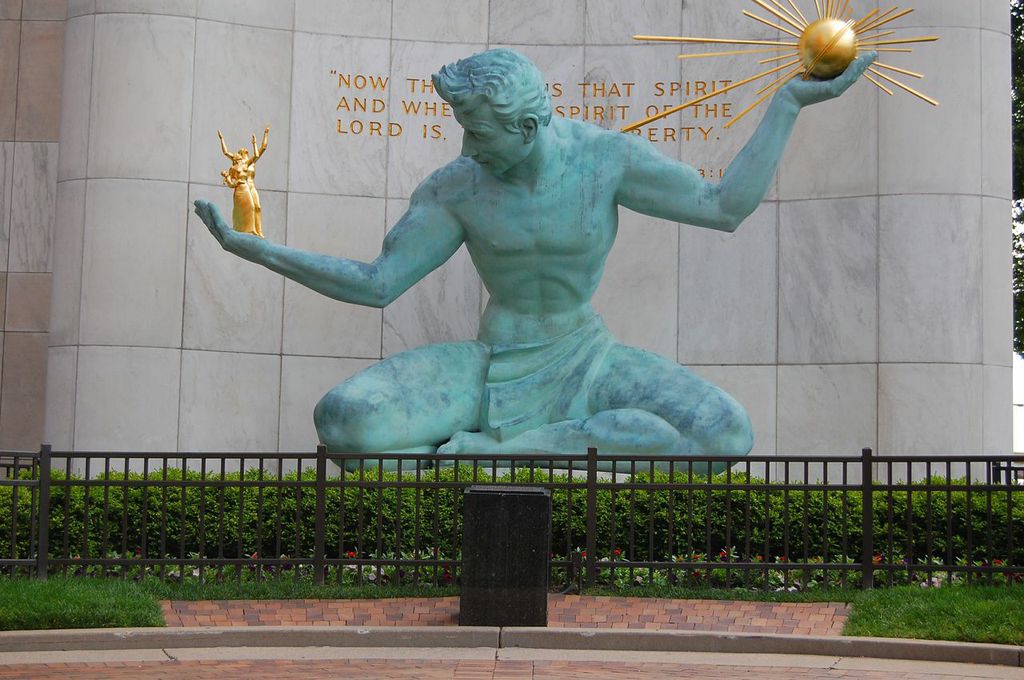 Seit 1958 sitzt der „Jolly Green Man“, wie ihn die Detroiter liebevoll nennen, mit gekreuzten Beinen und ausgestreckten Armen, den Blick nach unten gerichtet, vor dem Rathaus in der Woodward Avenue. Einen Namen hatte die acht Meter hohe Bronzeskulptur damals allerdings noch nicht. Lediglich eine Inschrift in der Wand hinter ihr, die von ihrem Schöpfer, dem Künstler Marshall Fredericks, angebracht worden war. Diese stammt aus dem 2. Korinther, Kapitel 13: „Denn der Herr ist der Geist; wo aber der Geist des Herrn ist, da ist Freiheit“. Abgeleitet von „Spirit of the Lord“ erhielt die Skulptur den Namen „Spirit of Detroit“.