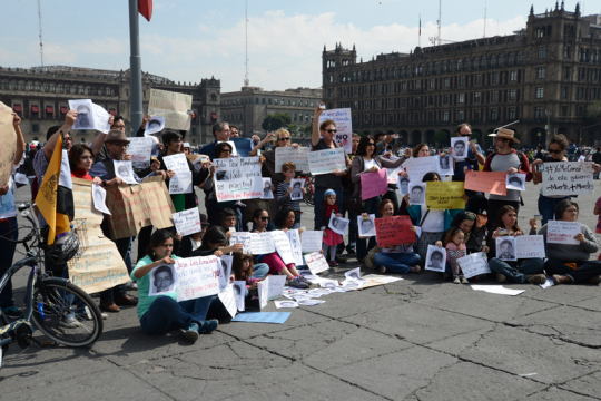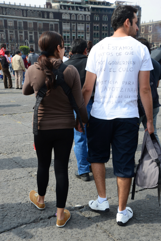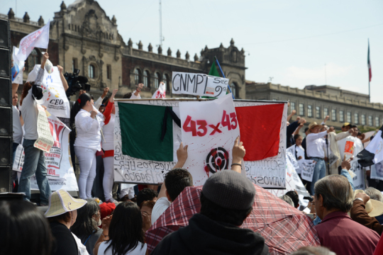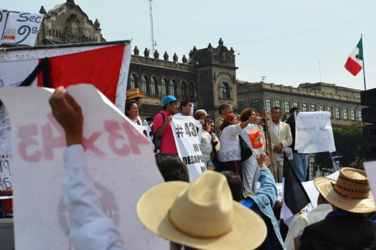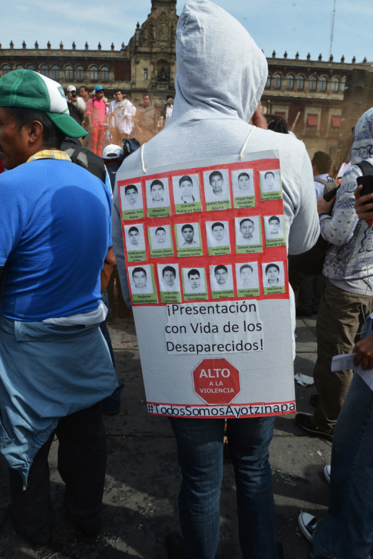 10. November 2014 auf dem Zócalo vor dem Nationalpalast: Teilnehmer eines einwöchigen Solidaritätsmarsches für die 43 ermordeten Studenten sind in Mexiko City angekommen. Aus Solidarität mit den Opfern marschierten 43 Vertreter sozialer Organisationen (einer für jeden Studenten) von Guerrero, dem Ort des Verbrechens, in die Hauptstadt.