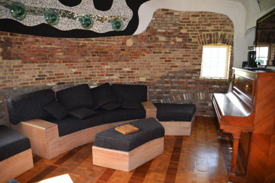 Die meisten Möbel hat er selbst entworfen und im entsprechenden Stockwerk zusammengebaut. Anders ging es nicht, denn für fertige Möbel ist die Treppe viel zu eng und kurvenreich. Ein spezielles Design sind die Sofas und Sessel im Wohnzimmer, die er wie ein Puzzle gestaltet hat – ein Element fügt sich ins andere.