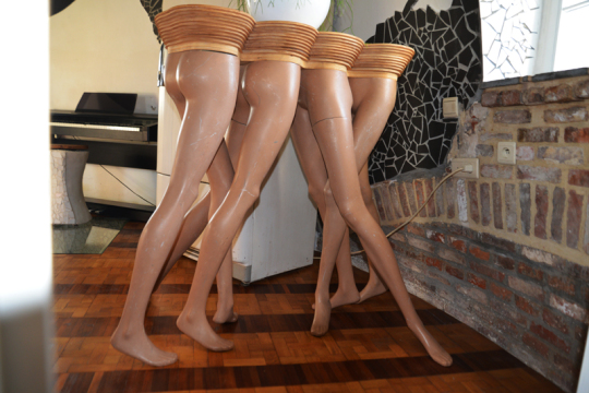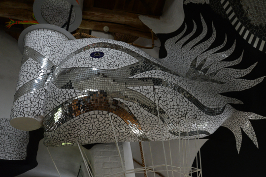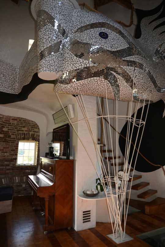 Van Praet erschuf sich damit seine eigene Unterwasserwelt und verwandelte diese Etage in einen Leuchtturm. Über dem Wal-Mosaik sind vier bunt bemalte beinlose Körper angebracht, deren Arme aus den Hüften ragen. Die Arme, über die ich mich in der ersten Nacht erschrak. Auf der Terrasse hat der Künstler seine Spuren in Form einer Reihe von Insekten aus alten Eisen und dem Esstisch aus Stein hinterlassen.