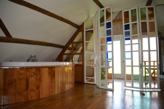 Das Bad aus massiver Eiche unter dem Dach ist ein wahres Prunkstück. Die bunten Spiegelmosaike an der dem großen Fenster gegenüberliegenden Wand verteilen das einfallende Licht gleichmäßig im Raum. Von der Badewanne aus hat man durch die großen Fenster einen unendlich weiten Blick über Bauernhöfe, Wiesen, Felder und Kühe. Der Flickenteppich aus gelben Feldern, grünen Wiesen und Kühen, die um eine Trauerweide stehen, wirkt wie ein Gemälde.