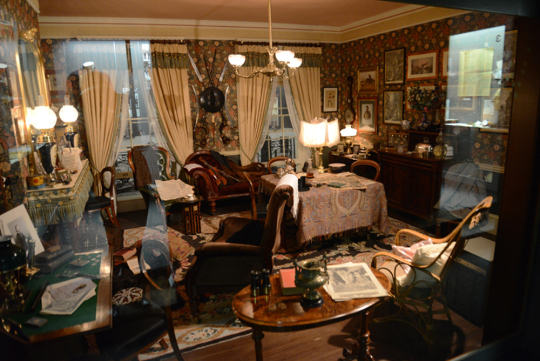 Glanzstück des Museums ist das authentisch rekonstruierte Wohnzimmer von Holmes und Watson in der Baker Street 221B in London. Im Kamin flackert das Feuer, auf dem Tisch steht Teegeschirr. Das berühmte Cape des Detektivs hängt über einer Stuhllehne, Hut und Handschuhe liegen auf dem Tisch.