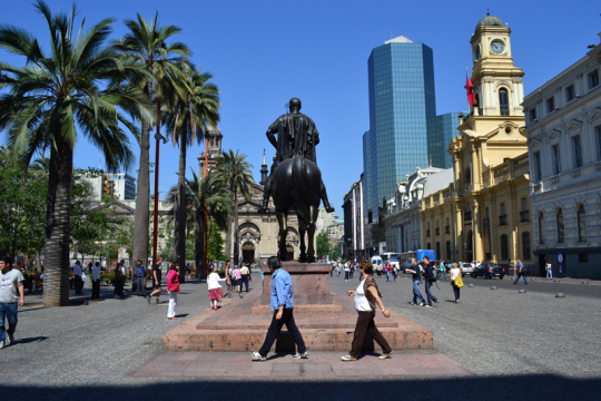 Erstes Ziel nach dem Essen ist das historische Zentrum. Wir winken ein Taxi heran und lassen uns zur Plaza de Armas fahren. Taxi fahren ist billig in Santiago. Die Fahrer sind sehr gesprächig und man erfährt unterwegs sehr viel über die Stadt – vorausgesetzt, man spricht Spanisch. Der Platz mit Arkaden und zahlreichen Parkbänken ist das Herz der Stadt und quirliger Treffpunkt von Studenten, Straßenkünstlern, Streichquartetten und Schachspielern.